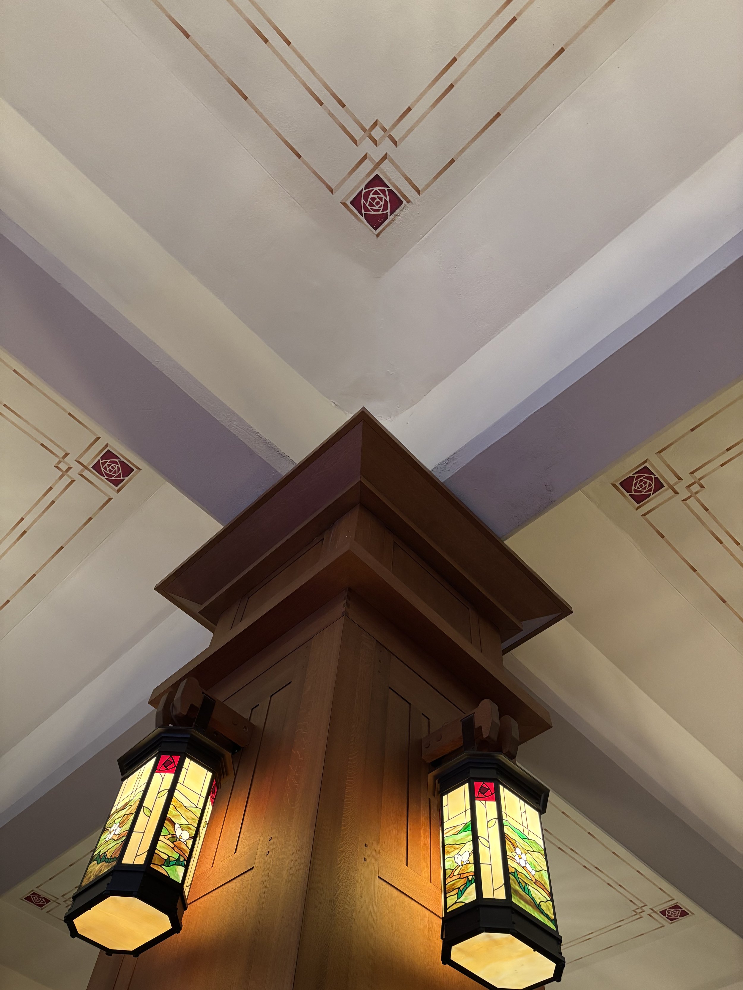 Roycroft light and art work in the lobby of the Grove Park Inn. Featuring the Dard Hunter Rose
